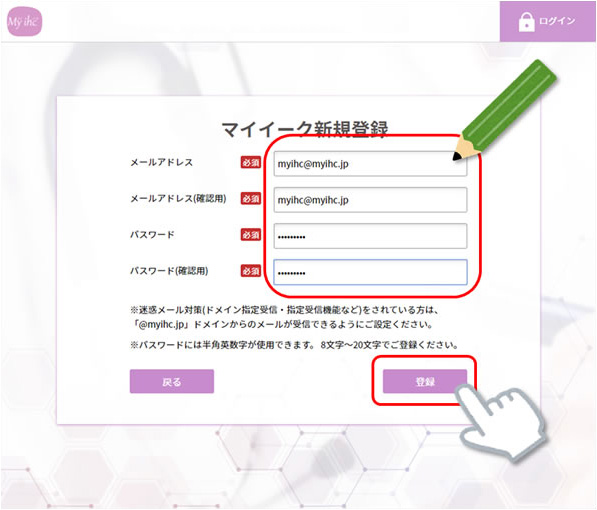 再度Myihcのページより、登録したメールアドレス、パスワードを入力し「ログイン」を選択します。