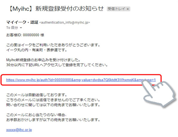 指定されたメールアドレスに新規登録受付メールが届きます。文中のリンクをクリックし、認証を完了させます。